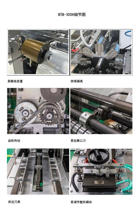 本機適用于各行業(yè)中的單件盒式物品的薄膜自動包裝(帶金拉線)。本機整體機架采用碳鋼噴塑、落地多開安全門結(jié)構(gòu),采用平推式推盒結(jié)構(gòu),更換模具簡單,調(diào)節(jié)距離多處采用手搖式調(diào)節(jié)尺寸,大大節(jié)省換模具時間,固定膜處采用氣漲軸輥固定,使換膜更簡單、快速。