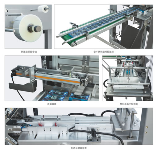 本機(jī)適用于各行業(yè)中的單件盒式物品的薄膜自動(dòng)包裝(帶金拉線(xiàn))。本機(jī)整體機(jī)架采用碳鋼噴塑、落地多開(kāi)安全門(mén)結(jié)構(gòu),采用平推式推盒結(jié)構(gòu),更換模具簡(jiǎn)單,調(diào)節(jié)距離多處采用手搖式調(diào)節(jié)尺寸,大大節(jié)省換模具時(shí)間,固定膜處采用氣漲軸輥固定,使換膜更簡(jiǎn)單、快速。